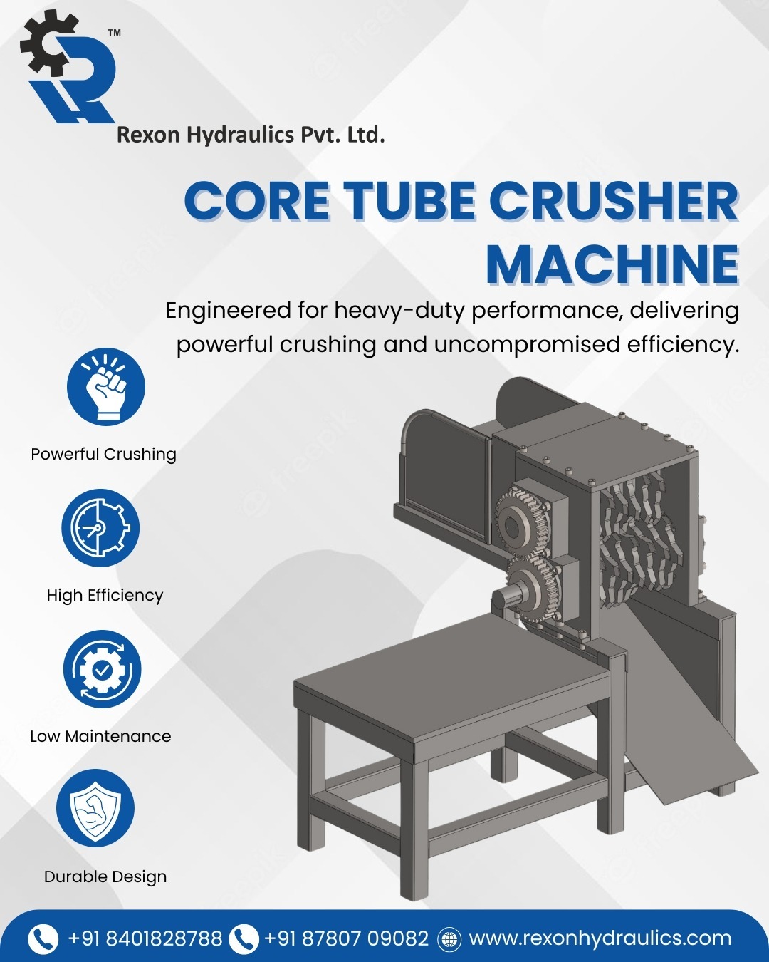 Best Core Tube Crusher Machine Manufacturers in Ahmedabad, Gujarat, India. Rexon Hydraulics Pvt. Ltd. is proud to be recognized as a leading and trusted name in manufacturing high-performance Core Tube Crusher Machines across India. Engineered for strength, precision, and long-term durability, our machine is designed to crush tough core materials such as paper, cardboard, and plastic tubes used in various industrial sectors.