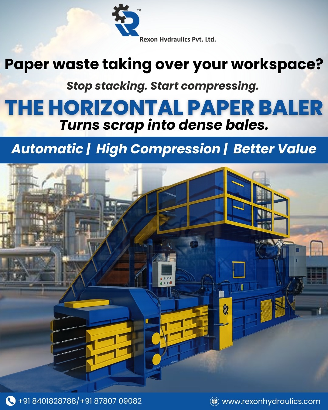Rexon Hydraulics Pvt. Ltd. is a leading manufacturer of Horizontal Paper Baler Machines in Ahmedabad, offering high-performance hydraulic baling machines designed for efficient recycling and waste management. These machines are widely used to compress large volumes of paper, cardboard, corrugated sheets, and plastic waste into compact, uniform bales. By reducing material volume, the baler helps industries save storage space, improve handling efficiency, and lower transportation costs.